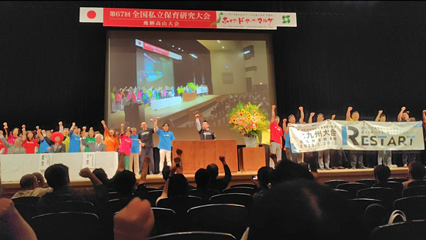 二日目はそれぞれのテーマに分かれて分科会が行われ、第8分科会では「保育の質の向上について 職員と園の成長を支えるマネジメント~個のスキルが成長するための組織の在り方とは~」というテーマのもと北九州市の三萩野保育園による提案発表がありました。また、分科会後の交流会では次回開催地、飛騨高山大会実行委員会によるアピールが行われ、楽しいひと時を過ごしました。