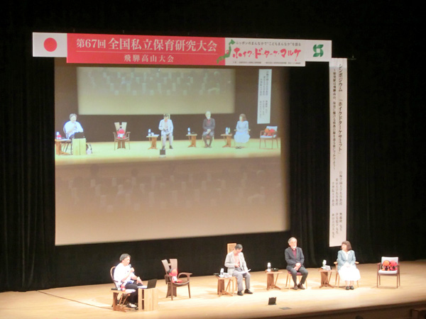 大会初日は、開会式、表彰式、行政説明、基調報告と続きシンポジウムでは無藤隆先生、汐見稔幸先生、秋田喜代美先生3名の先生方それぞれの保育の世界に入ったきっかけやこれまでの歩み、後に続く研究者や保育者へのメッセージなど、現在の保育や子育て、子どもたちの未来につながるヒントをたくさんいただきました。