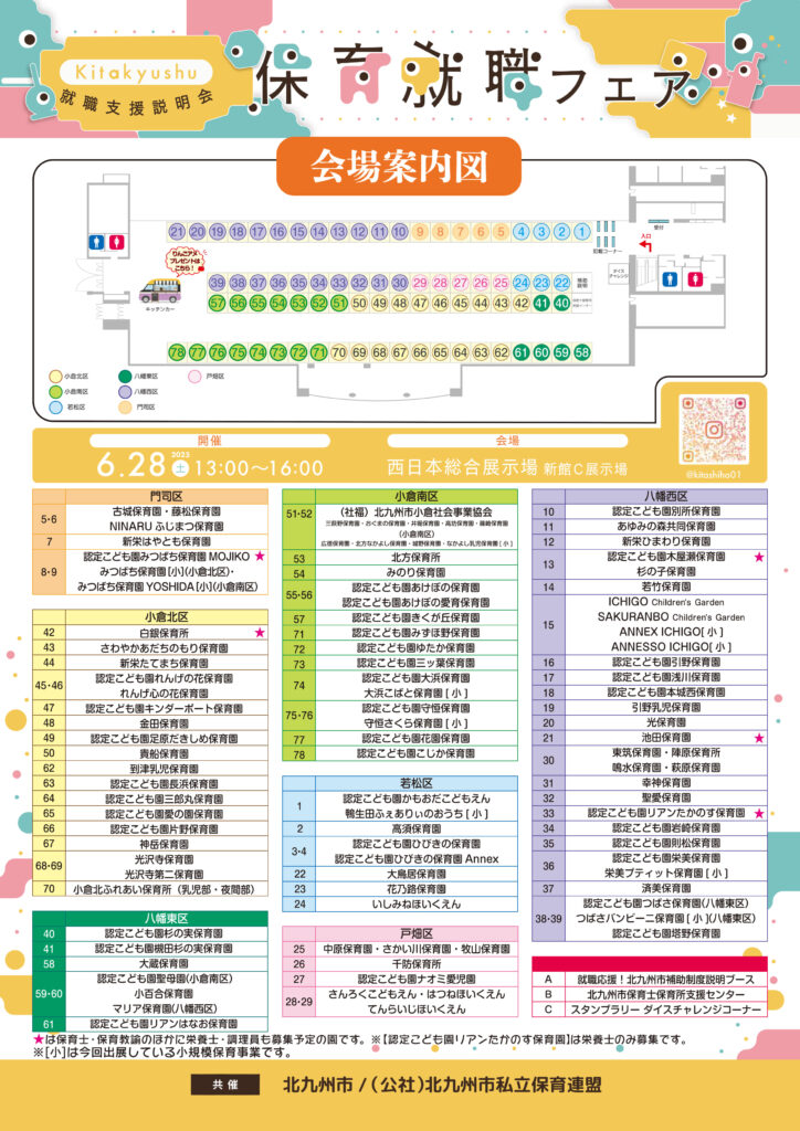 当日は北九州市内の約90もの民間保育所(園)・認定こども園などが個別ブースを出し園の魅力や取り組み、保育の方針など園の担当者から直接お話を聞けるチャンスです!!